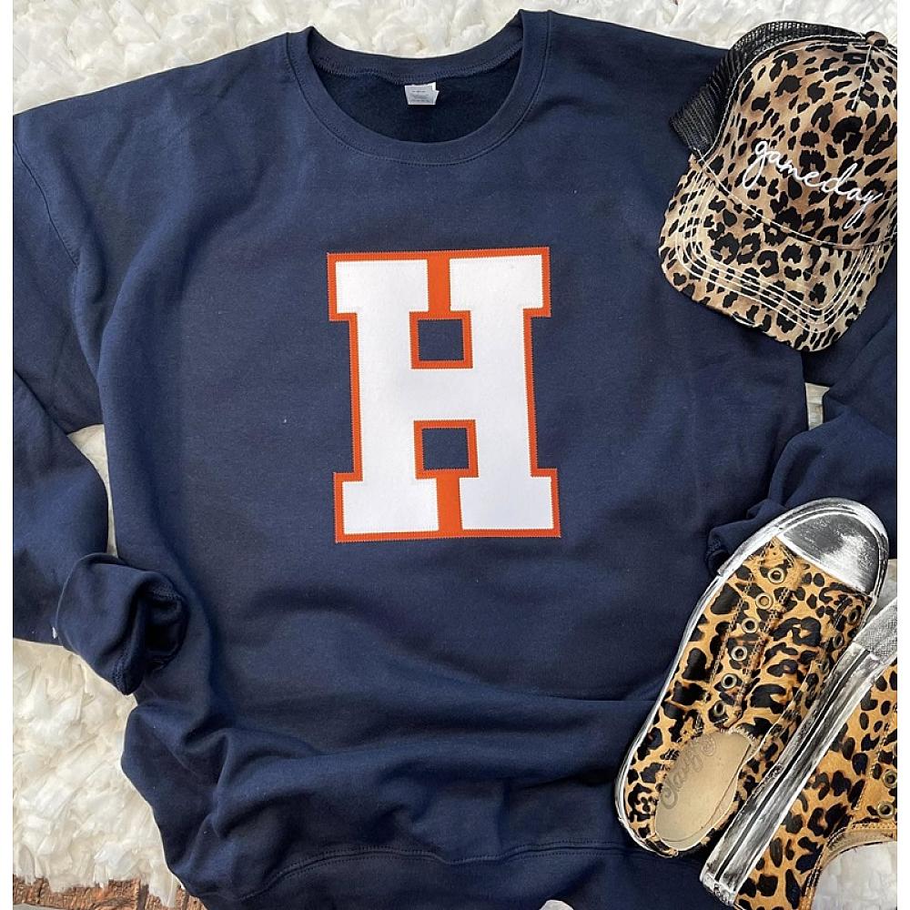 TWILL VARSITY H WITH FAUX EMBROIDERY APPLIED WITH PERMANENT ADHESIVE ON OUR FAVORITE TULTEX SWEATSHIRT.