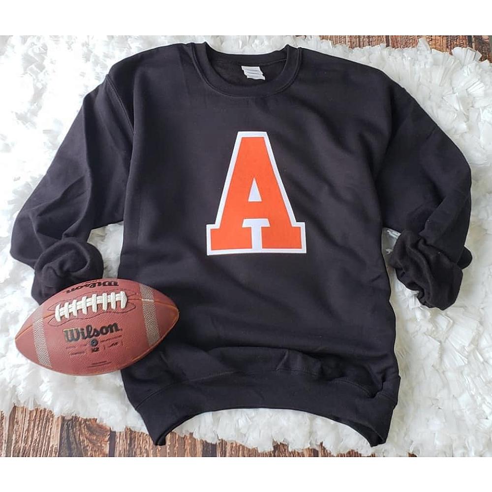 TWILL VARSITY A WITH FAUX EMBROIDERY APPLIED WITH PERMANENT ADHESIVE TO OUR FAVORITE PORT & CO SWEATSHIRT. AVAILABLE IN ORANGE OR BLACK.